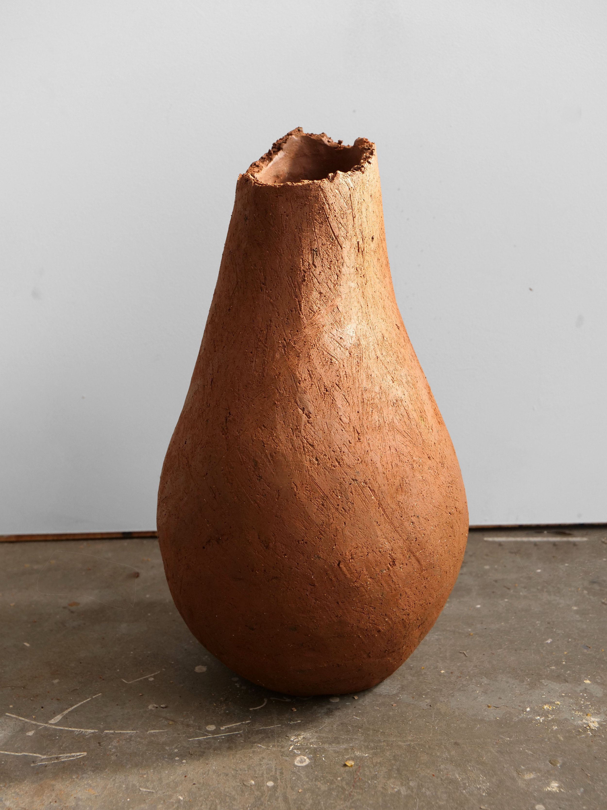The clay for this vessel was sourced from land at the foothills in Altadena that burned in the firestorm of January 7, 2025. The night the fires started I turned my recording device on and let it run until the batteries died. It took me months to listen to it. The howling wind becomes even more haunting when echoing in the earth vessel. This piece is meant to be experienced while held so the viewer/listener can share an intimate and contained moment with the force thatchanged so many of our lives in Los Angeles.